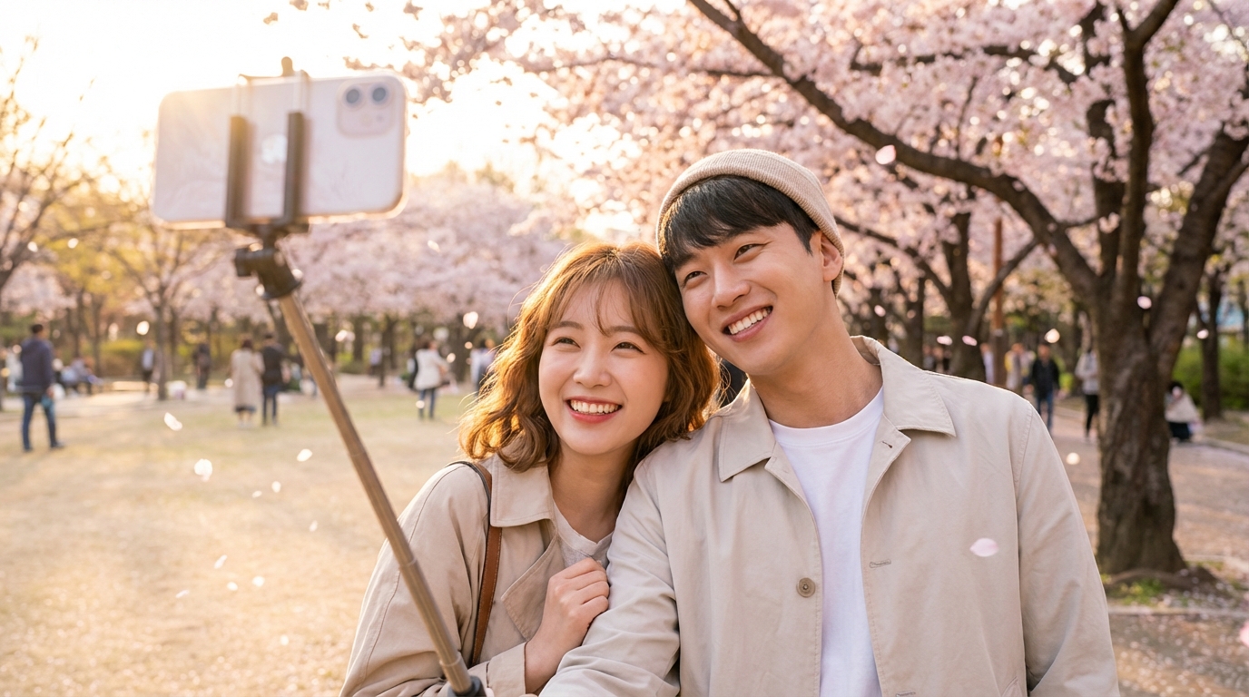 벚꽃 시즌이 돌아왔다. 여의도, 석촌호수, 경의선숲길. 인스타에 올릴 커플 사진 한 장을 위해 나가는 건데, 막상 현장에 가면 문제가 생긴다. 셀카로 찍으면 얼굴만 크게 나오고 벚꽃은 안 보인다. 지나가는 사람한테 부탁하면 각도가 엉망이다. 삼각대를 따로 가져가자니 가방이 무거워지고, 사람 많은 벚꽃길에서 큰 삼각대 펼치면 솔직히 민폐다.
