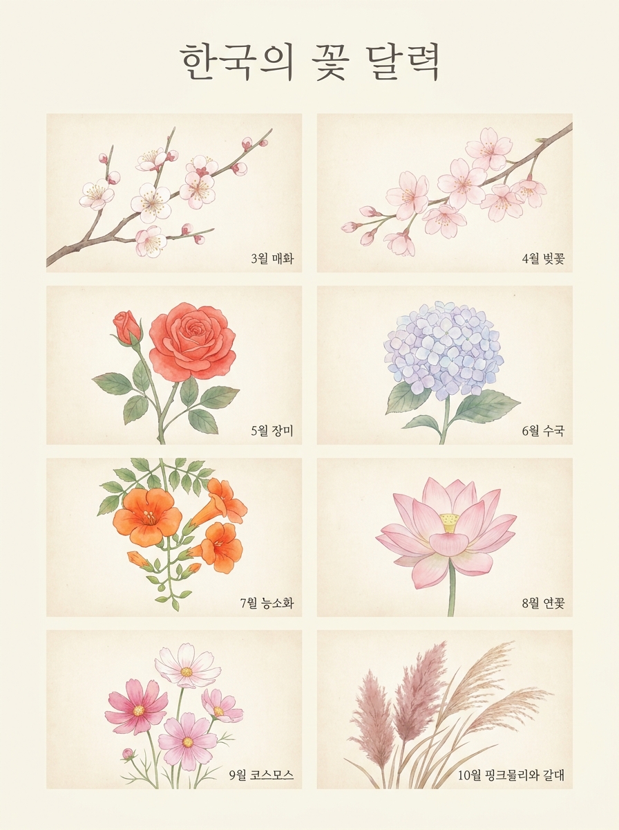 꽃은 매년 잠깐씩만 핀다. 올해 못 보면 1년 기다려야 한다. 이 달력을 저장해두고, 매달 다음 꽃이 뭔지 한 번씩 확인하는 습관을 들이면 꽃을 놓치는 일이 없어진다.